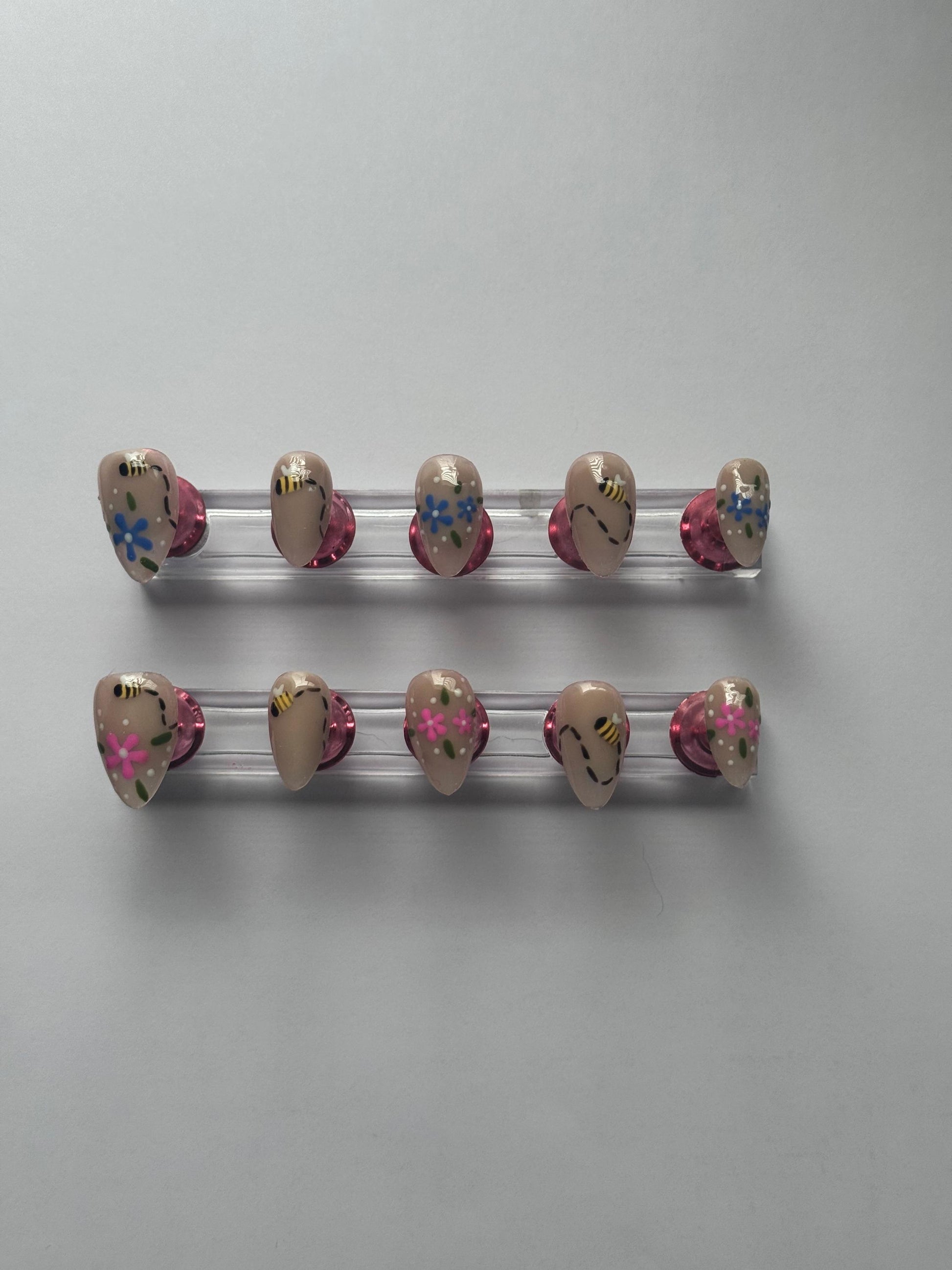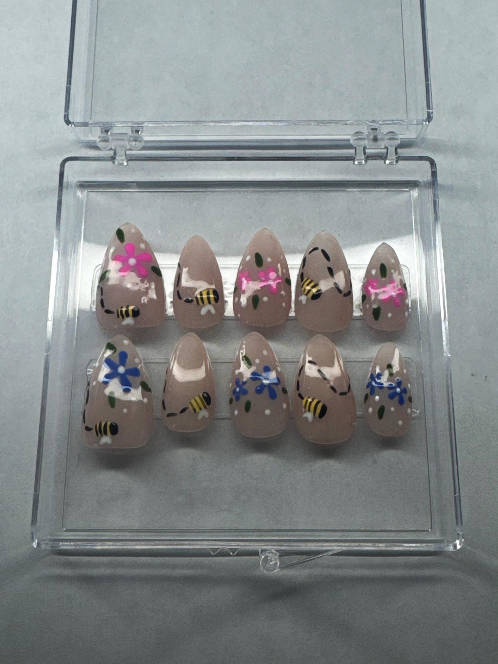 Bee Floral Press On Nails | Nude Base Spring Nail Set | Handmade Custom Nails | Cute Nature Nail Art | Reusable Almond Nails