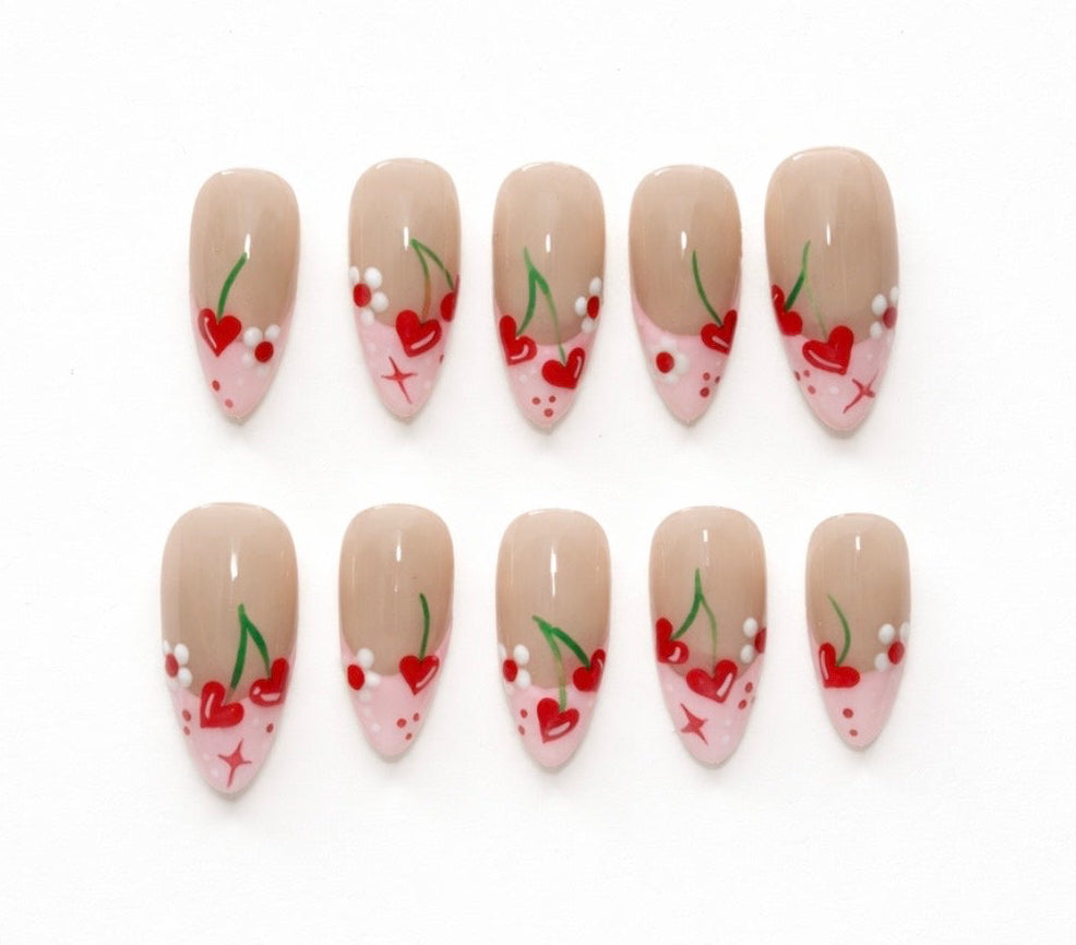 Cherry Crush is a playful, statement-making press-on nail set featuring a soft nude base with pink French tips and cherry-inspired heart details with subtle accent dots for a sweet Valentine vibe. This design is perfect for everyday wear or special moments when you want your nails to stand out without trying too hard.