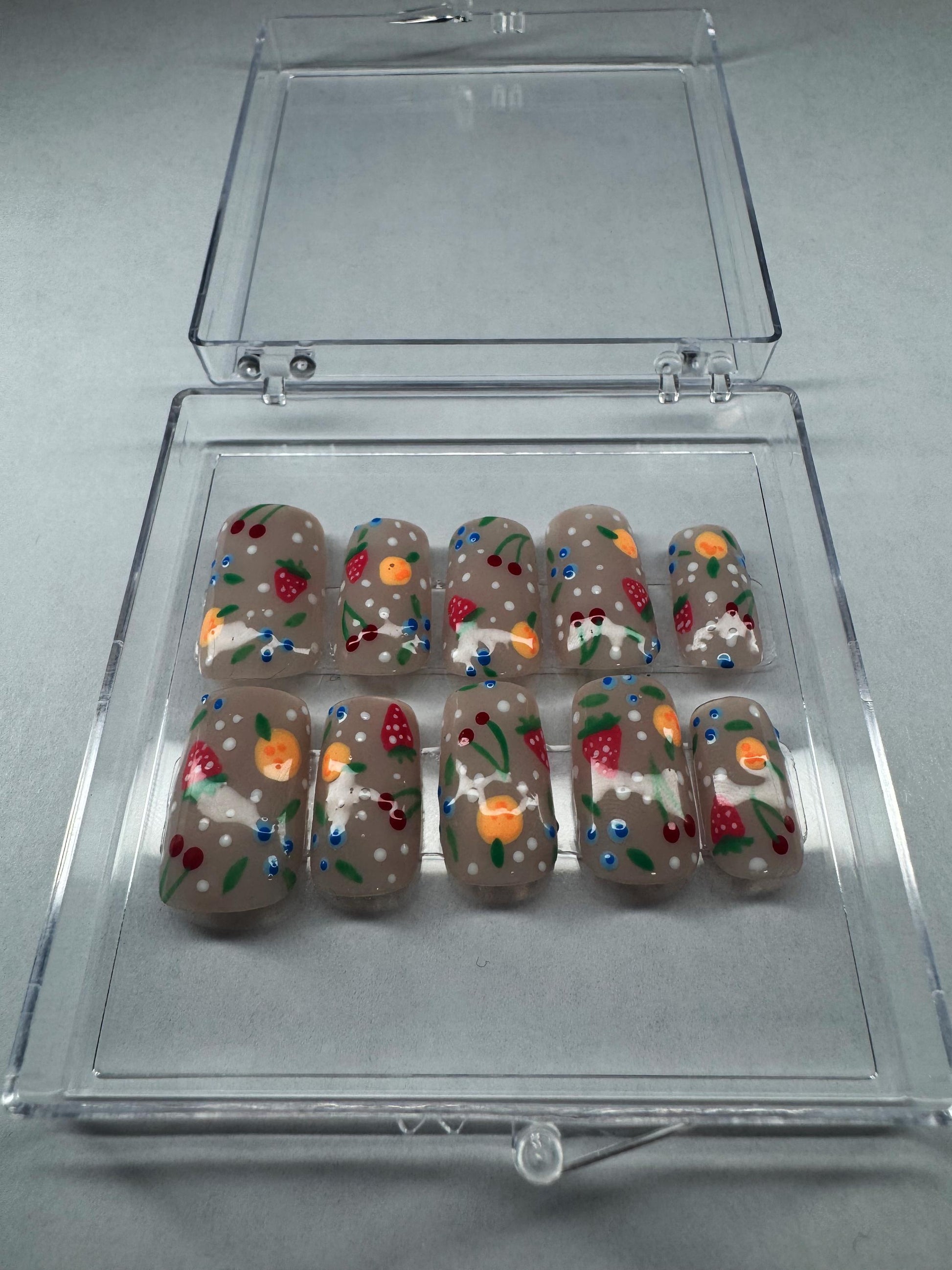 This fruity press-on nail set is bursting with color and charm, featuring hand-painted strawberries, oranges, cherries, and other fun fruit designs over a soft taupe base. Each nail is crafted with care and attention to detail, offering a playful, juicy vibe that’s perfect for summer or adding a pop of fun to your everyday look. These nails are handmade, reusable, and fully customizable to your preferred shape and size. Sweet, bold, and made to stand out!