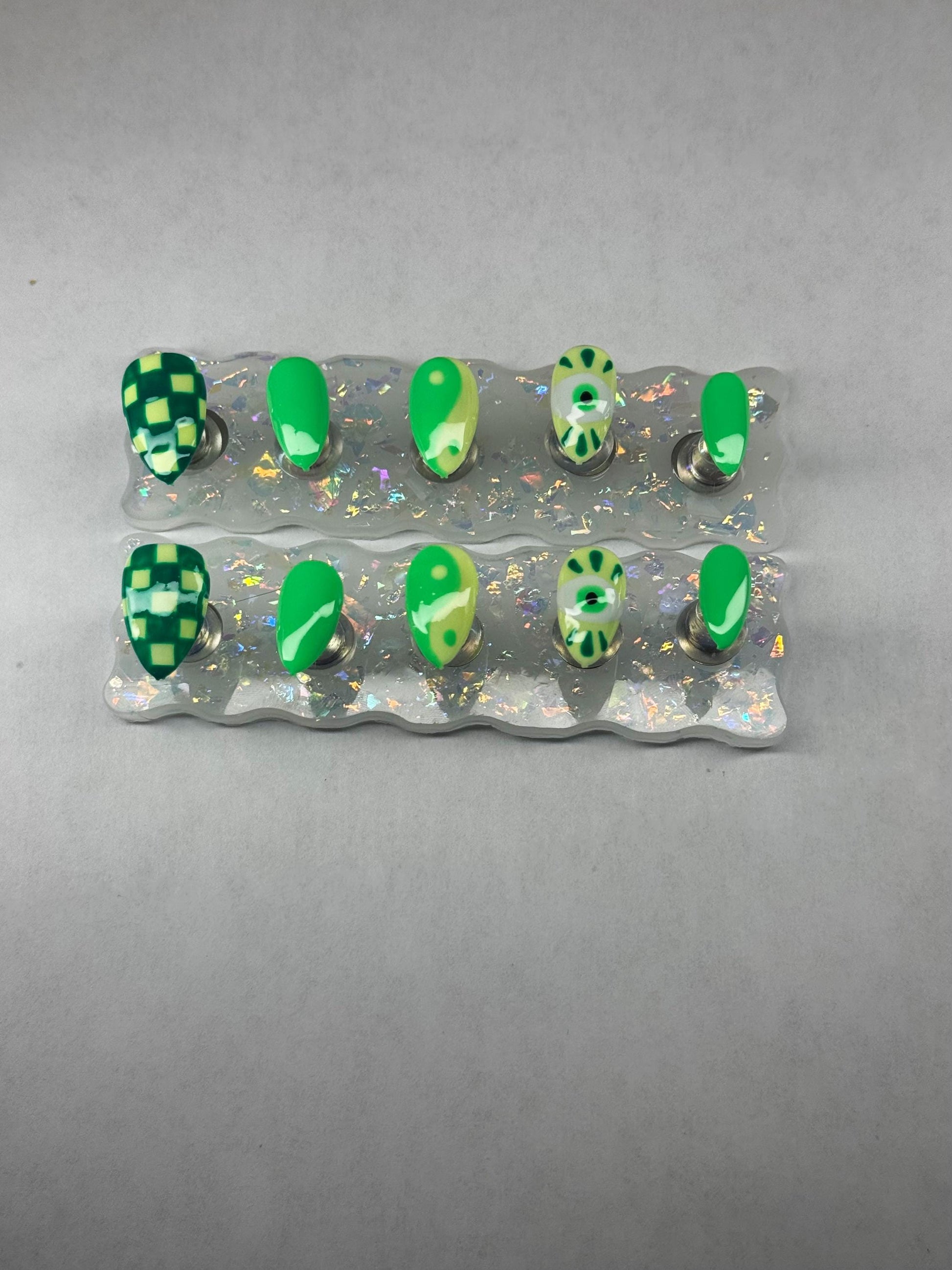 This fun and funky press-on nail set features a mix of mismatched green and yellow patterns, including checkerboard, abstract swirls, and floral eye accents. Bright and bold, this design brings a playful spring vibe with serious attitude. Each nail is handmade and reusable, giving you a high-quality, custom look without the salon trip. Whether you're feeling groovy, retro, or just love unique nail art, this set is sure to make a statement.