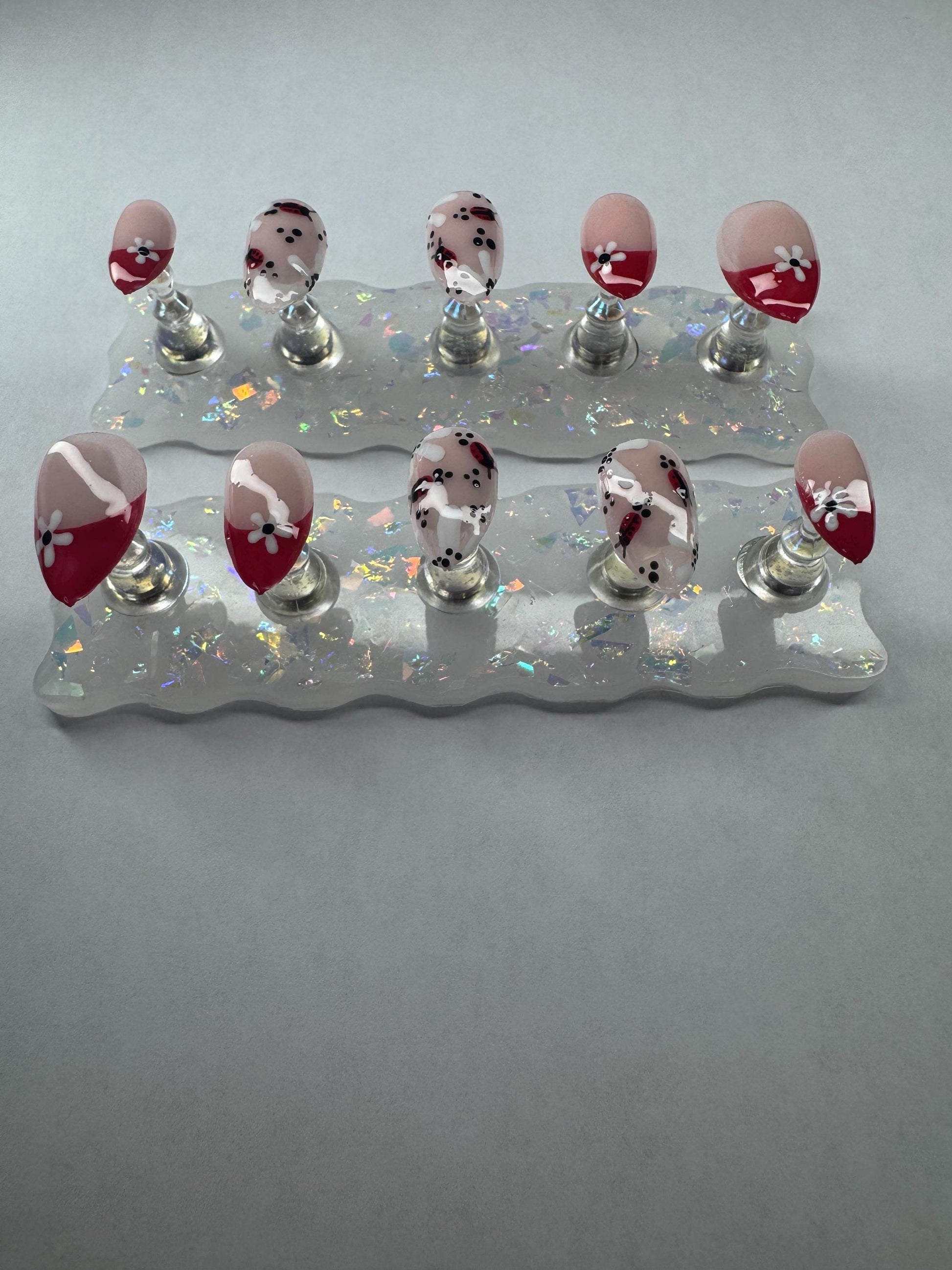 This whimsical press-on nail set features a charming mix of red French tips, playful daisies, and hand-painted ladybugs on a soft nude base. Perfect for spring and summer, this set brings a fresh, fun vibe to your fingertips. Whether you're planning a picnic, celebrating the season, or just love a unique nature-inspired look, these glossy, reusable nails are a sweet and stylish choice. Handmade with care and fully customizable by shape and size.