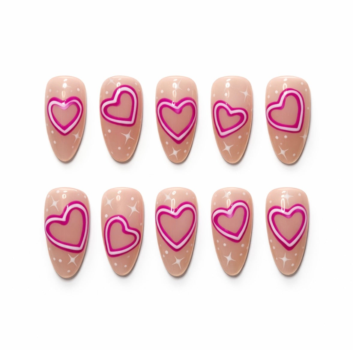 Love Notes is a playful, statement-making press-on nail set featuring a soft nude base with layered pink heart details and subtle sparkle accents for a sweet Valentine vibe. This design is perfect for everyday wear or special moments when you want your nails to stand out without trying too hard.