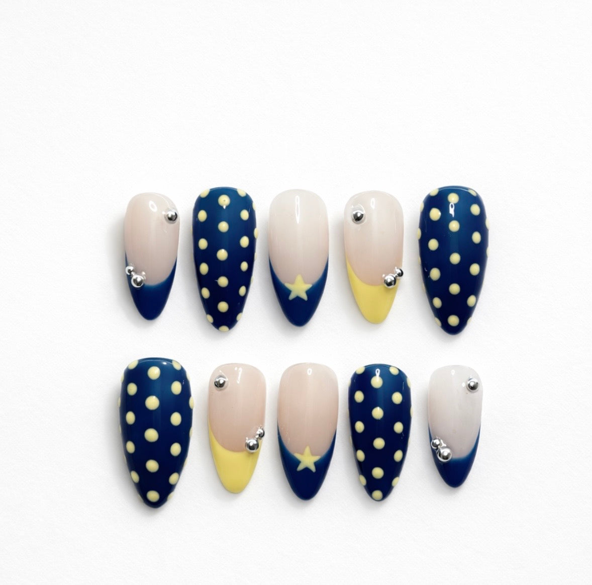 Soft Nightfall is a playful, statement-making press-on nail set featuring deep navy French tips, soft milky nude bases, and bold yellow star and polka dot accents. This design balances a dreamy night-sky vibe with fun, high-contrast details, making it perfect for everyday wear or moments when you want your nails to stand out without trying too hard.